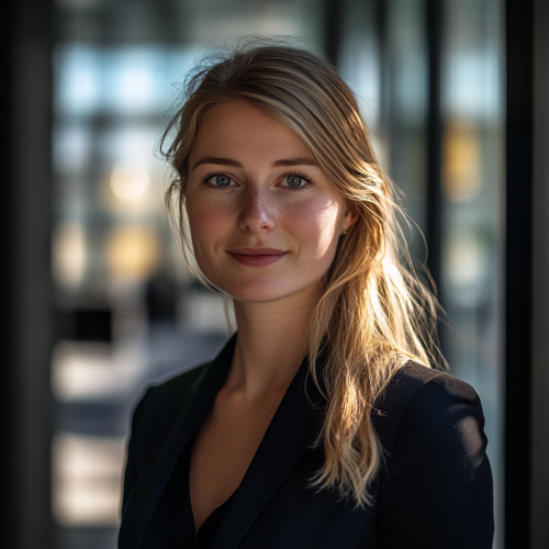 ‘Remove the terms working time and free time from your vocabulary. Replace them with life time and ask yourself: Does it make sense what I'm doing?’ create a very photorealistic image of an attractive smiling woman. The image should look like it was taken with a Fuji camera, with sharp details, natural shadows and a slight film-like grain. Camera specifications: Shot with a Fuji X100V with a 23mm f/2 lens, with a wide aperture to create a soft background blur while keeping the businesswoman in focus. Lighting should be soft, with a cool tone.