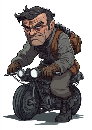 A smuggler clad in rugged, post-apocalyptic attire, standing confidently behind a heavily modified Mad Max-style car, set in the arid northern desert behind Los Santos, illustrated in the vibrant and exaggerated Grand Theft Auto V art style. The smuggler has a fierce expression, with goggles perched on their head and a variety of gear strapped to their body. The car is adorned with spikes and makeshift armor, showcasing its battle-ready design. The barren desert landscape stretches out behind them, with distant mountains and a dramatic sky. The scene features bold outlines, rich colors, and a cinematic feel, capturing the gritty and adventurous atmosphere of GTA V.
