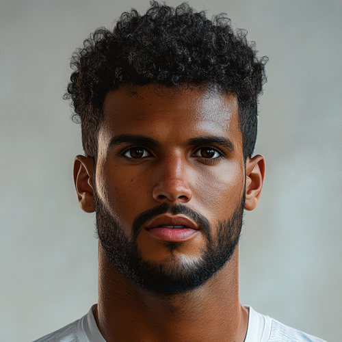 ultra-realistic 8k portrait, brazilian professional soccer player, short black curly hair with sides faded, light-hearted, facial hair, dark skin complexion