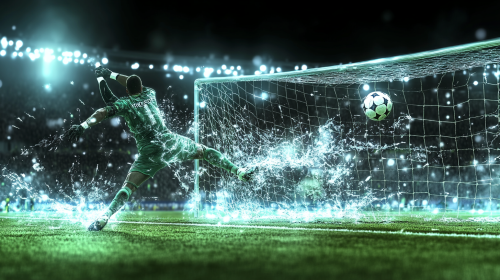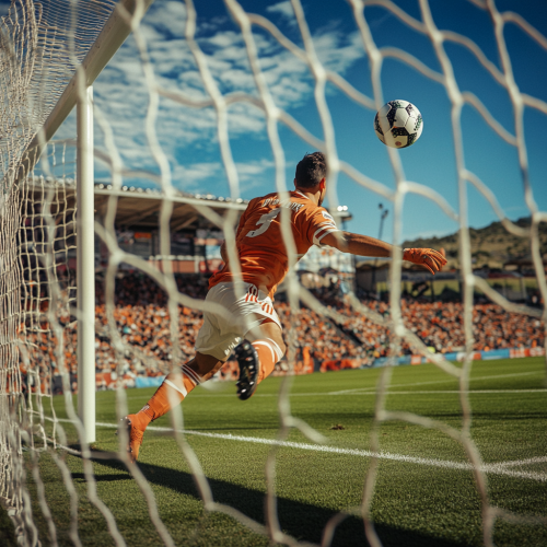 Create a highly detailed photograph capturing the moment immediately after a soccer player has evaded an opponent's pursuit and taken a shot at the goal. Focus on the player's expression of determination and intensity, with the ball in motion toward the goal. The background should include a dynamic stadium atmosphere with cheering fans, highlighting the excitement of the match