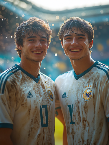 create a photo realistic image, 2 male soccer players, 1 white, 1 spanish, standing straight, happy, playful, cyan and black, stadium background --ar 3:4 --s 750