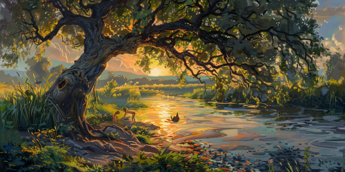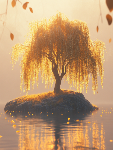 A weeping willow tree growing on an island in the middle of calm water, an ethereal minimalist art style, with golden light, rendered in Cinema 4D, in the style of traditional Chinese landscape painting, a soft and dreamy scene, a tranquil atmosphere, with surreal and fantastical elements --ar 3:4