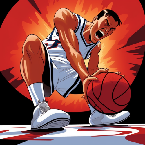 a basketball player. Depict the moment when the player slightly bends forward and touches the lower back area with his hand, displaying an expression of discomfort due to sudden pain. Bruce Timm comic