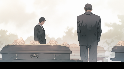 Takehiko Inoue Style Animation Tone. Son and father standing at the funeral. a black suit. a lonely figure from behind. --ar 16:9 --niji 5
