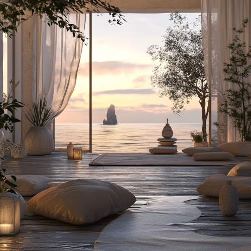 A soothing and tranquil scene that captures the essence of relaxation and calm. The setting could be a serene and comfortable environment, such as a cozy, softly lit room, a peaceful nature setting like a quiet beach at sunset, or a tranquil garden with gentle, calming elements. The central focus is on elements that promote relaxation, such as a figure in a restful pose, a cozy nook with calming decor, or a peaceful natural scene. The background features soft, calming colors like gentle blues, warm neutrals, and pastel greens to enhance the feeling of serenity and relaxation. Subtle details like soft lighting, gentle textures, or calming patterns add to the atmosphere of peace and tranquility. The overall mood is restful and soothing, capturing the essence of unwinding and finding calm in the moment.