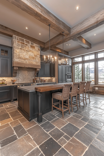 Show a kitchen with Stonewash Sophistication gray kitchen cabinets, featuring a textured finish that mimics the look of natural stone. These cabinets should be paired with a sleek black quartz countertop and stainless steel appliances for a modern rustic look. Add a reclaimed wood dining table and iron chandeliers to complete the sophisticated yet earthy decor. The floor should be natural slate tiles, complementing the cabinets' stonewash texture. This kitchen should blend rustic charm with refined elegance, appealing to those who appreciate natural beauty. Camera: DSLR - Canon EOS 5D Mark IV. Lens: Canon EF 24-70mm f/2.8L II USM. Composition: Wide shot, room-centered, horizontal orientation, balance between furniture and space. Film: Digital, high resolution, color profile sRGB. Camera settings: ISO 400, f/2.8, 1/60 sec. --ar 2:3 --v 6.1 --s 250