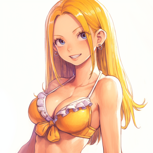 Anime girl, amused face, straight yellow hair, babe, beautiful, swimmer, white background, half body, pin up pose, Akira Toriyama style --niji 6 --style raw --s 750