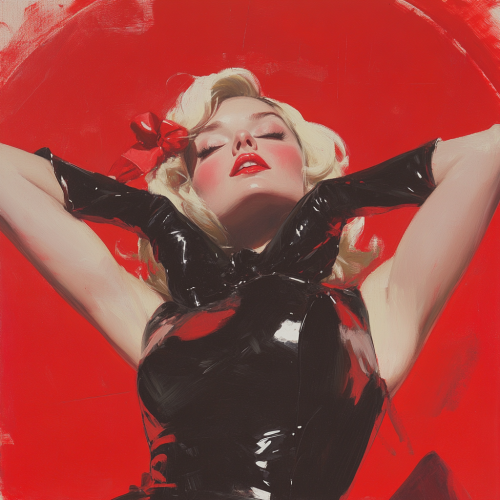Smiley edgar allan poe dressed as a pin up girl model, wearing a thigh leather dress. Cute pose, 3/4 view, full body:: Pop art style --p 7qy62s5 --s 250