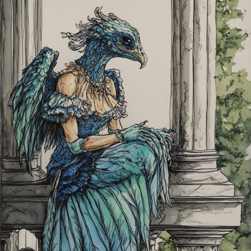 pen and ink drawing colored in with watercolors of a harpy girl with a human head, no arms, talon legs and azure feathers dressed as a southern belle, perched on the porch of a plantation manor