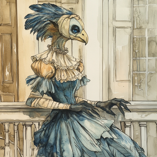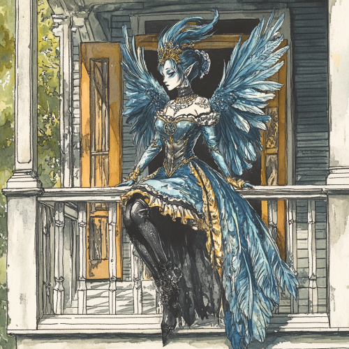 pen and ink drawing colored in with watercolors of a harpy girl (wings instead of arms) with azure feathers dressed as a southern belle, perched on the porch of a plantation maner