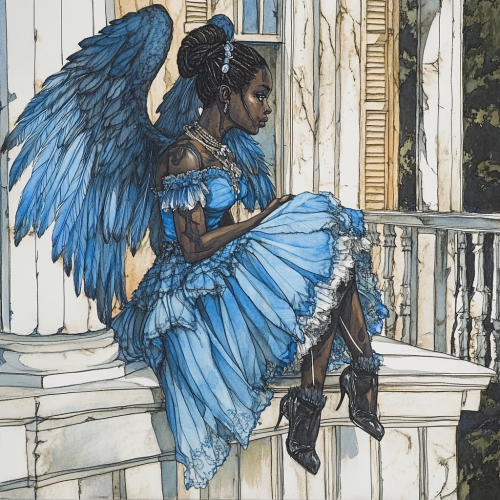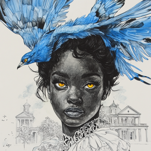 pen and ink drawing colored in with watercolors of a young southern belle with dark skin, bright yellow eyes, blue feathers instead of hair, and blue feathered wings instead of arms flying above a southern plantation