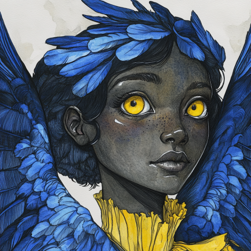 pen and ink drawing colored in with watercolors of a young southern belle with dark skin, bright yellow eyes, blue feathers instead of hair, and blue feathered wings instead of arms