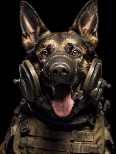 aerial perspective,A Belgian Mallinois in a Special Forces costume fighting in a doomsday style world, HD, close - up, laughing, straight into the camera, photography style --ar 3:4 --v 5.1