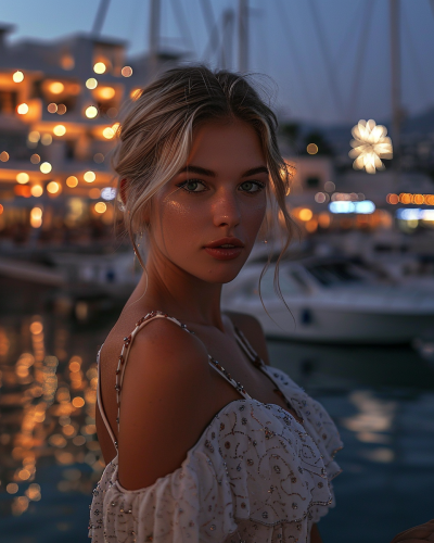 Realistic photo, detailed background, front face, Latchi Harbour, Cyprus, night, firework in the sky, the building showing the text "2024", 20 years old beautiful female model,s miling, slim face, Smooth and Clear Skin, Green eyes color, Blonde hair color, mini dresses --ar 4:5 --v 6.0