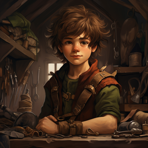 Jorin, a brave boy with a knack for crafting things from wood and wild brown hair, with a mischievous smile.