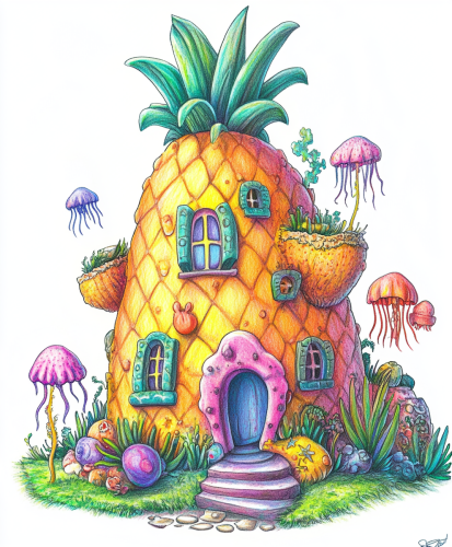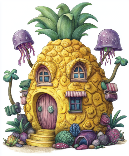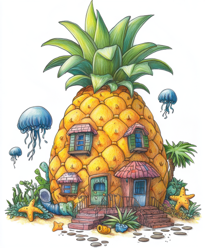 simplified the pineapple house from Spongebob square pants hand-drawn in colored pencil, in the style of Nickelodeon cartoons, white background three color limit, starfish, jellyfish, snails, and drawn to appeal to twelce year old children, t shirt design --ar 5:6