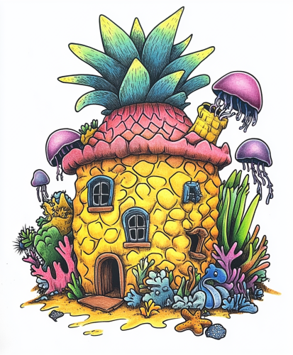 the pineapple house from Spongebob square pants hand-drawn in colored pencil, in the style of Nickelodeon cartoons, white background three color limit, starfish, jellyfish, snails, and drawn to appeal to twelce year old children, t shirt design --ar 5:6