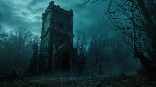 Spooky, abandoned castle in foggy forest, illuminated by spotlights.