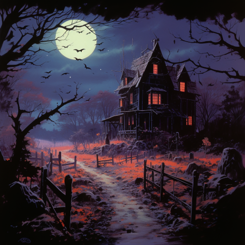 1980s seinen anime by Yoshiyuki Sadamoto, landscape, halloween, haunted house, ghosts, bats, jack-o-laterns, autumn, night, full moon, fallen leaves, spooky, macabre,