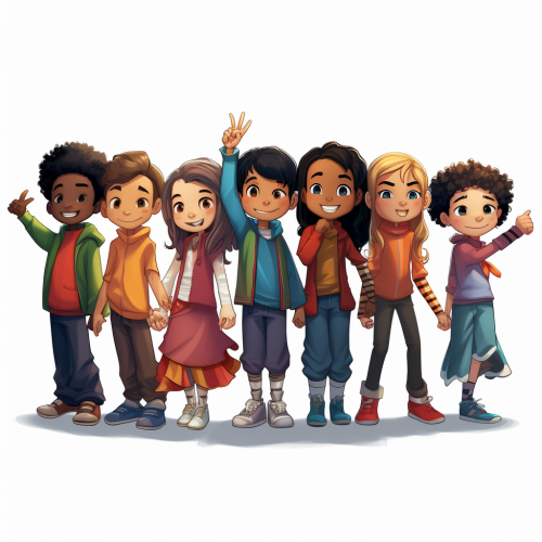 a diverse group of cartoon children standing in a row with colourful clothing or oranges, blue and burgundy. They are smiling, waving and/or holding hands. Backdrop is transparent.
