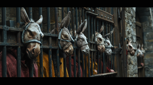 a row of people locked up in stocks, with plaster donkey heads placed on them to mock them. Style is medieval dark fantasy --v 6.0 --ar 16:9