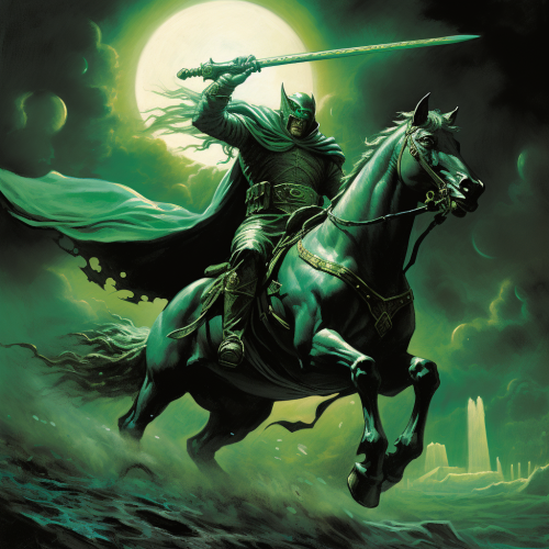 A fusion between Green Lantern, and Frank Frazetta's Death Dealer rides into battle on a green horse, wielding a green energy battleaxe.