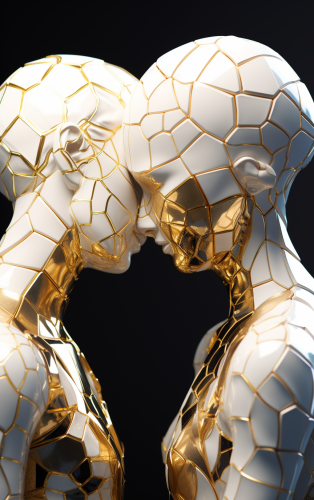 a stunning porcelain sculpture of a kissing couple, half body, fragmented in pieces, geometric, low poly, kintsugi, gold inlay, hihg resolution, majestic, showpiece, CGSociety, 3d model Artstation, cinematic lighting, 8k, octane render --ar 10:16