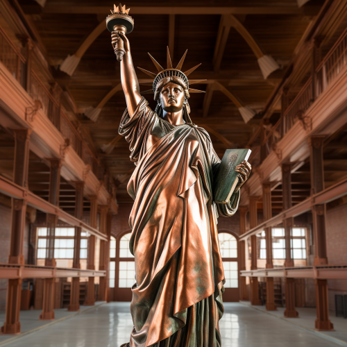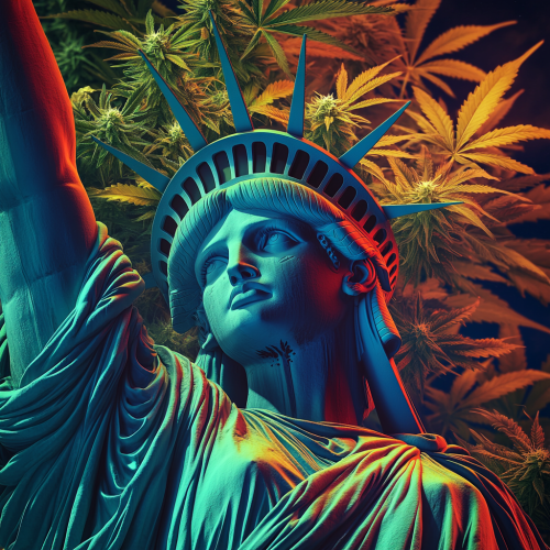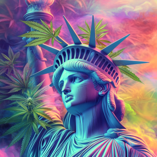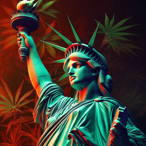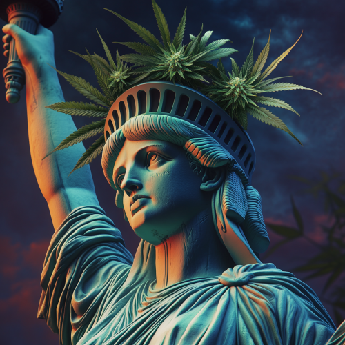 high quality, photorealistic detailed image shot with a DSLR camera, vibrant colors, photo quality, with a close up detail shot of the statue of liberty with a crown of cannabis leaves and a cannabis leaf on the top of her torch