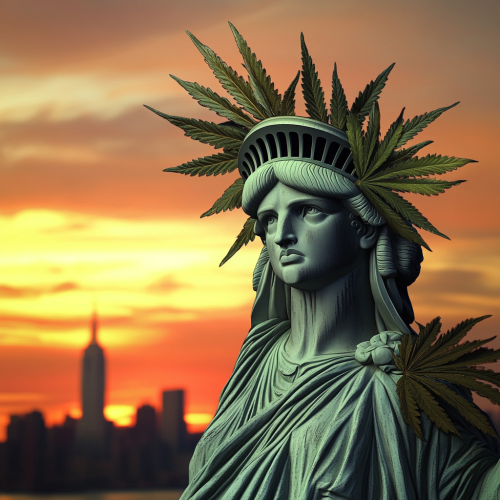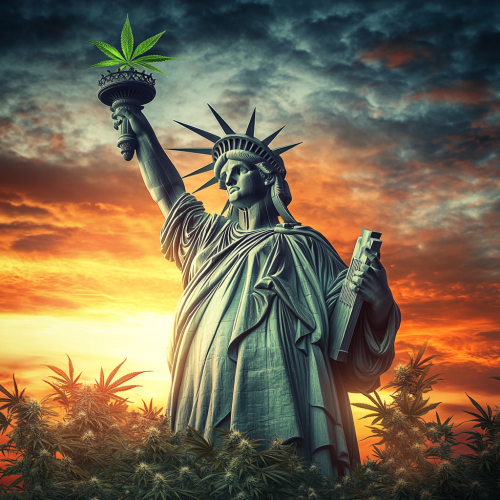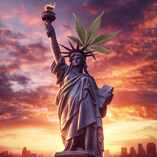 high quality, photorealistic detailed photograph taken with a DSLR camera, vibrant colors, photo quality, photograph of the statue of liberty with a crown of cannabis leaves and a cannabis leaf on the top of her torch