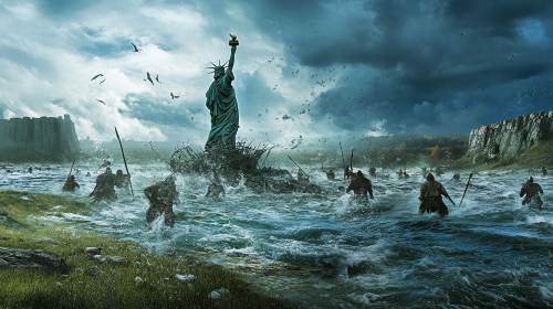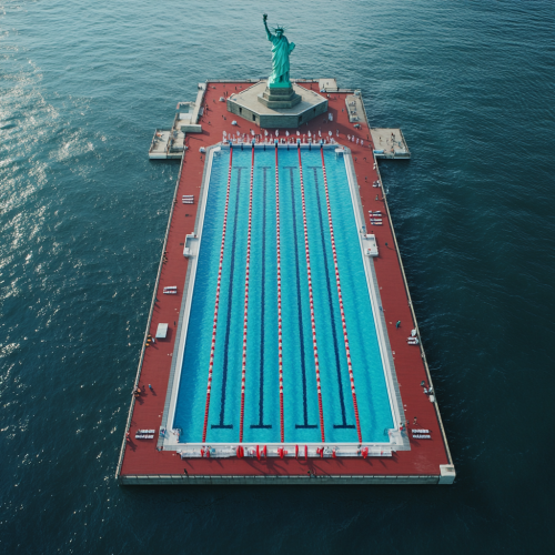 Concept image of an iconic olympic swimming pool with red and white lane ropes, located in the water directly beneath the statue of liberty. The stature of liberty has a red and white towel draped over her arm. Aerial shot. Fujifilm, --style raw --ar 1:1