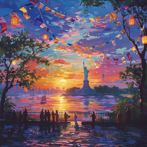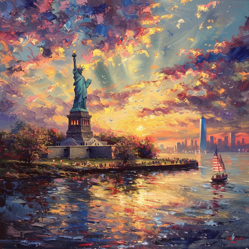 Painting of the Statue of Liberty with a backdrop of an American patriotic celebration, in the style of Thomas Kinkade, featuring soft pastel colors, sunset lighting, a wide-angle perspective. --s 250 --v 6.0