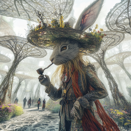an asymetric eye level photo realistic full body point of view of a dark edgy very cool, long haired steam punk rabbit smoking a pipe with a huge twig hat, a flowing long red and green grass scarf, yellow flowers, looking away from the camera, walking through a grove of tall, multiple sized of umbrella tree like forms, in an abstract pattern, translucent and opaque, embossed with a doilie pattern, many people, shadow patterns on the ground