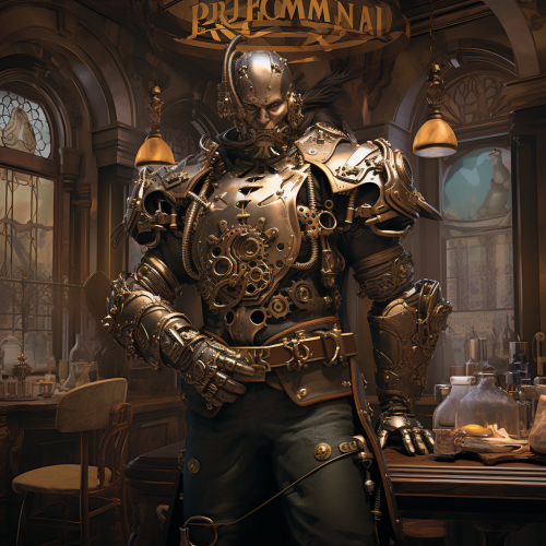 in frank frazetta's style: In a bustling, steampunk-inspired brasserie, a waiter clad in a polished, cog-adorned uniform gracefully serves patrons with an array of gear-shaped trays and steam-powered espresso machines, embodying the fusion of mechanical precision and culinary artistry. Their attentive demeanor and polished brass fixtures reflect the harmonious blend of Victorian elegance and industrial innovation, bringing an air of sophistication to this clockwork-themed eatery.