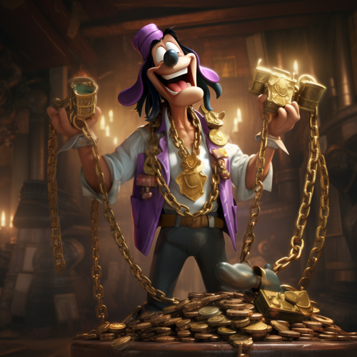goofy from Disney wearing street clothes and gold chains, standing in from of stocks of cash holding a purple drink and smiling