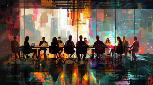Business, meeting with AI elements, Light image, photorealism --v 6.0 --ar 16:9