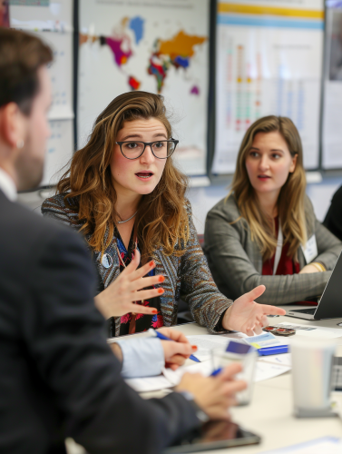 ultra high resolution, real life photo, business people in a modern and cozy meeting room, people are engaged and listening intently, elegant furniture, soft ambient lighting, predominantely white colours, sunlight streaming through the windows, creating warm reflections --s 250