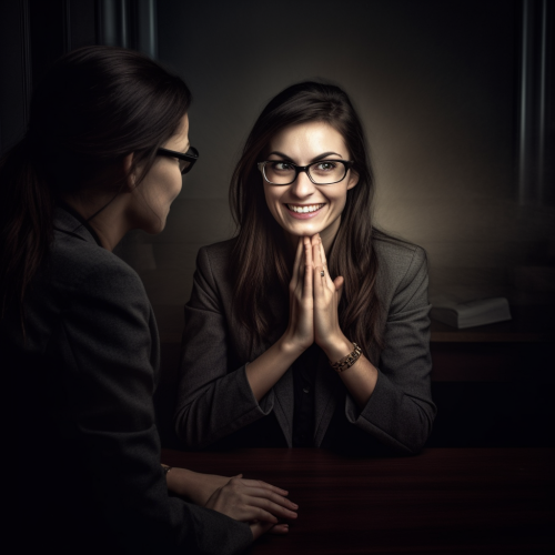 professional, photo realistic image of a business woman eavesdropping on a important business meeting, and the business woman is ringing her hands together, and grinning in an evil mysterious way --v 5.0 --s 750