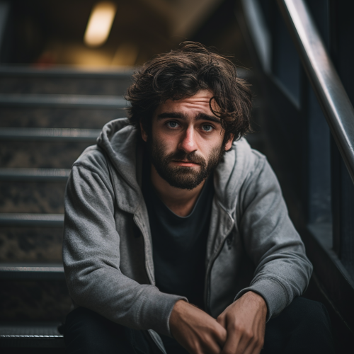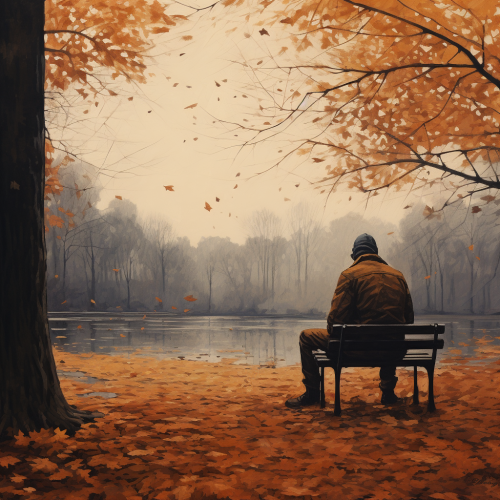Picture a sad man trying to touch his own shoulder. Have the man look back at the viewer over his right shoulder. Have long hair and miserable clothing. Make this picture so that we can see the man from the right side, with his back slightly turned towards us. man with his left hand over his right shoulder to his right shoulder blade. Let him try to touch it. Let the left side of the man's face be in shadow and the light shine over his right shoulder. Make the picture in oil painting style. Let the man be anatomically proportionate. Let the man's entire body be visible, down to his kneecaps. Let there be pastel shades of green, blue and yellow in the picture. Let the background be dark. Let there be a burning lamp and an open book on the floor on the left.