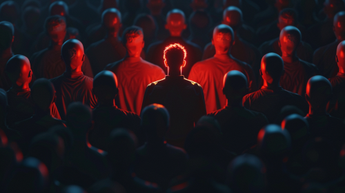 be standout 3d concept, one man glowing among other people in dark condition, --ar 16:9 --v 6.0