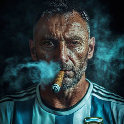 stocky short white guy with salt and pepper short hair . He’s in his 40s with a Argentina soccer jersey on smoking a cigar, cinematic , dynamic, contrast