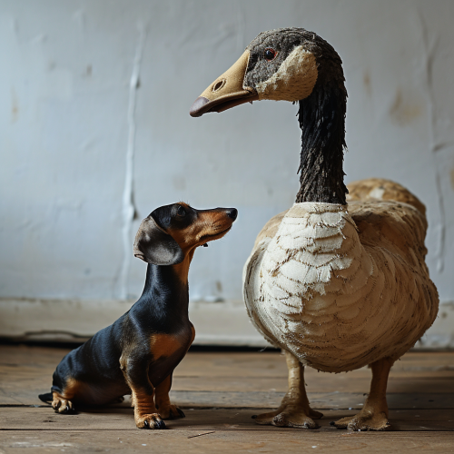 A small dachshund dog, just 50 cm, attacked a stuffed goose, 160 cm tall. --v 6.0 --ar 1:1