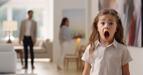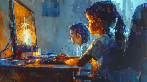 portrait of two 7 year old children sitting in front a one computer, behind them is her mother watching them in an armchair in the living room of her house --v 6.0 --stylize 200 --ar 16:9