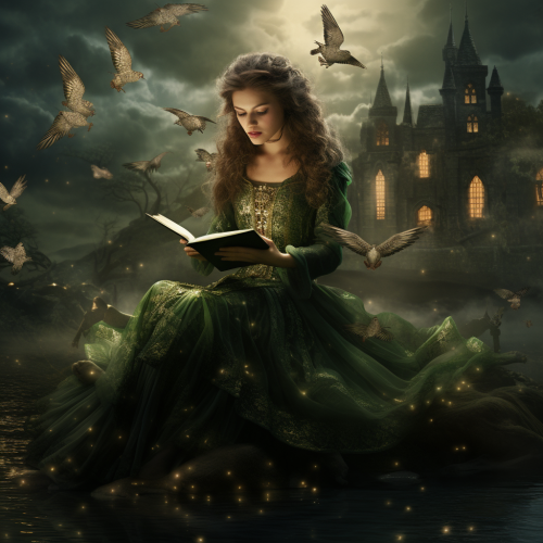beautiful girl in fairy tale outfit with beautiful makeup side view sitting pensively in the right side of the image on the background fairy tale image flowers birds sunshine fantasy world --ar 16:9