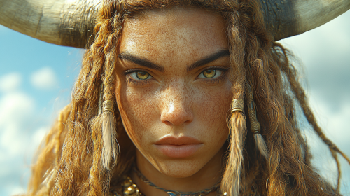 a beautiful but intimidating dnd female firbolg barbarian, with long cow floppy ears, vitiligo skin, Mediterranean features, dark features, plus sized woman, giant height, alternative, heavyweight curly hair, full body. fine details, hyper maximalist, 3D rendering, C4D, depth of field, high-definition photography, natural lighting, full HD 8K --ar 16:9 --stylize 750 --v 6.1 --chaos 7 --weird 2