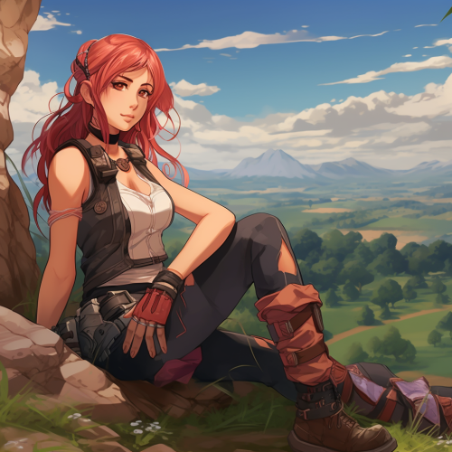 anime female strong barbarian relaxing twoards the camera along the countyside in the style of studio ghibli