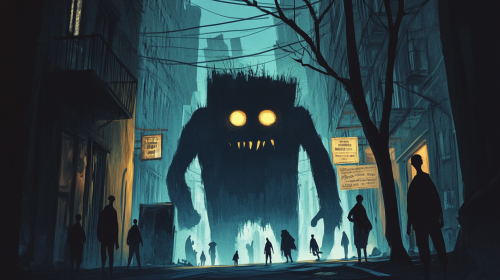 acrylic on rough canvas painting. Goddess kali is walking down a dark, lonely street. Her skin is blue and has large red bindi on her forehead and her hair is dishevelled and her red tongue is out. In the alley, a few shadowdy figures of men with glowing eyes are looking at her. Scoops and smears of paint, palette knife. --v 6.0