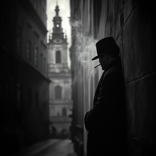 a man in a hat, a spy, leaning against a wall watches the street of old Prague, from street is a view of the famous Prague monument, black and white very detailed photo, dark alley and atmosphere, his back is not visible to his face, he smokes a cigarette, cigarette smoke rises in the dark