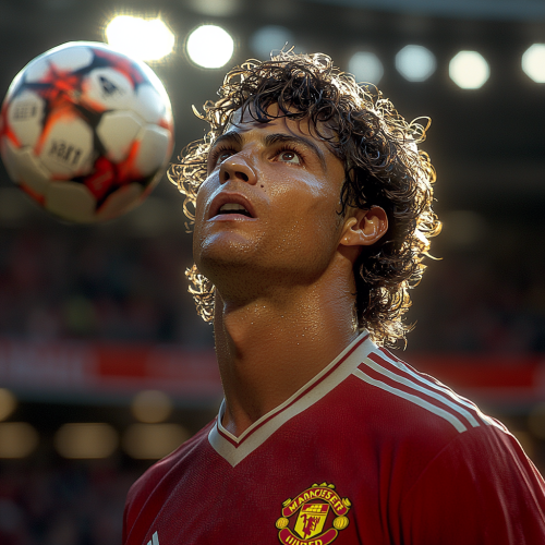 cristiano ronaldo in 2008 in his manchester united uniform looking up at a ball in the air. Make sure he is wearing a manchester united 2008 training jersey with his curly hair. Make it a sunny day in a stadium, photorealisitc high resolution --s 750