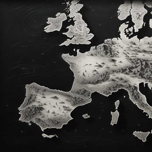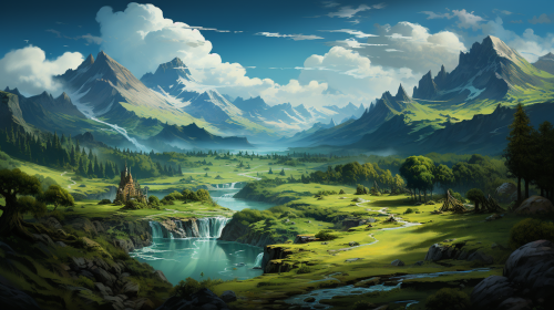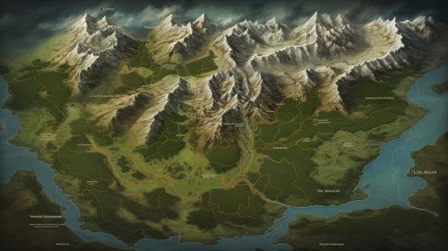 draw a detailed map of an ancient continent, with glaciers to the north. to the south, going east, large forests and mountain ranges. place swamps, lakes, forests --ar 16:9 --s 750
