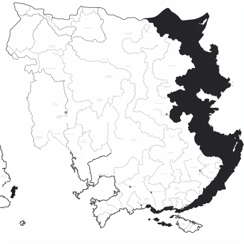 Generate a black and white line drawing map of India with the following specifications: The map should clearly demarcate the following four regions with distinct borders: Himalayan Heights: Encompassing the Himalayas, the valleys of Kashmir, the plains of Punjab and Uttar Pradesh, and extending into parts of Nepal and Bhutan. Desert Dynasties: Covering the Thar Desert, Rajasthan, and Gujarat, and extending into parts of Pakistan's Sindh region. Dravidian Depths: Including Tamil Nadu, Kerala, Karnataka, Andhra Pradesh, and extending into parts of Sri Lanka. Bengali Bays: Covering West Bengal, Odisha, the northeastern states, and incorporating parts of Bangladesh and Myanmar. The map should also display significant landmarks like the Himalayas, Thar Desert, Western Ghats, and the Bay of Bengal.
